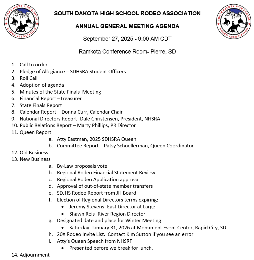 Dale and some of the other national directors will travel to Missouri and Lincoln to review the facilities for possible future NHSRF locations. The 2025 finals will be held again in Rock Springs. Rock Springs ensured that they are working to improve the location this year and SDHSRA will have 44 full/dry camping spots, each person will only get one spot.
